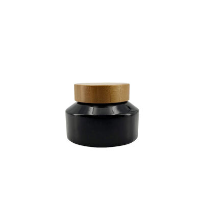 Premium black glass cosmetic cream jars with natural bamboo lids, designed for facial creams, lotions, and skincare products. Available in 30ml and 50ml capacities.